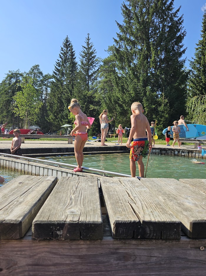 De camping ligt rustig gelegen aan een meer en midden in de natuur. We konden er heerlijk zwemmen en lekkere wandelingen maken. De camper mochten we plaatsen waar we wilden. We zochten een plekje dicht bij het meer en met een speelhuisje dichtbij.