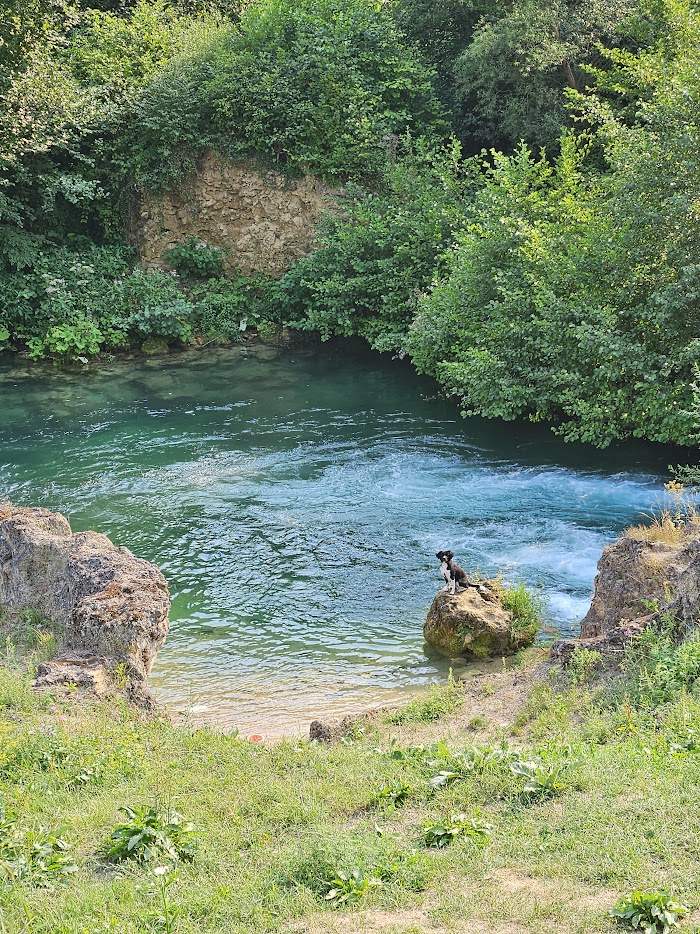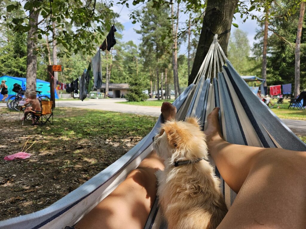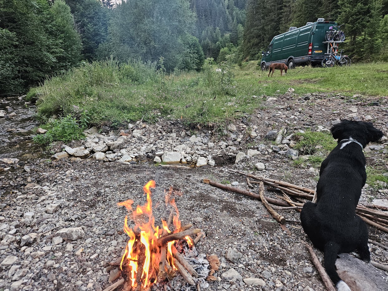 De camping zelf is heel rustig. We parkeerden de camper aan het einde van de camping op een plek waar we meteen aan het beekje stonden. Op de foto zie je dat ook een van onze honden niet bij het beekje vandaan te slaan was. Wanneer wij zaten te eten bij de camper, zat hij nog op de steen aan het water.