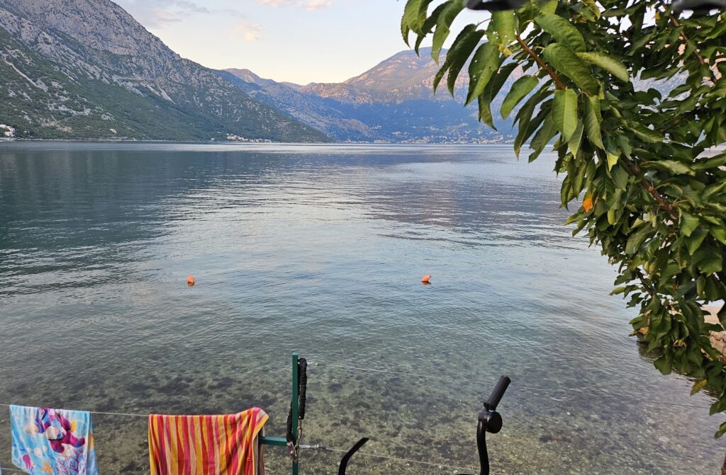 We kozen er voor om 1 nacht te verblijven op Kamp Djule, vlakbij Kotor en direct gelegen aan de baai van Kotor. Dit is een kleine camping, maar ligt dus wel direct aan het water. We hebben de SUP opgeblazen en de kinderen hebben zich heerlijk vermaakt in de zee. De camping is prima voor een nacht. Het sanitair is oké, maar verder is er op de camping niets. Een klein supermarktje is op loopafstand en Kotor of Budva – de grotere plekjes – liggen te ver weg om met de fiets te bezoeken. We betaalden €25,- voor een overnachting.