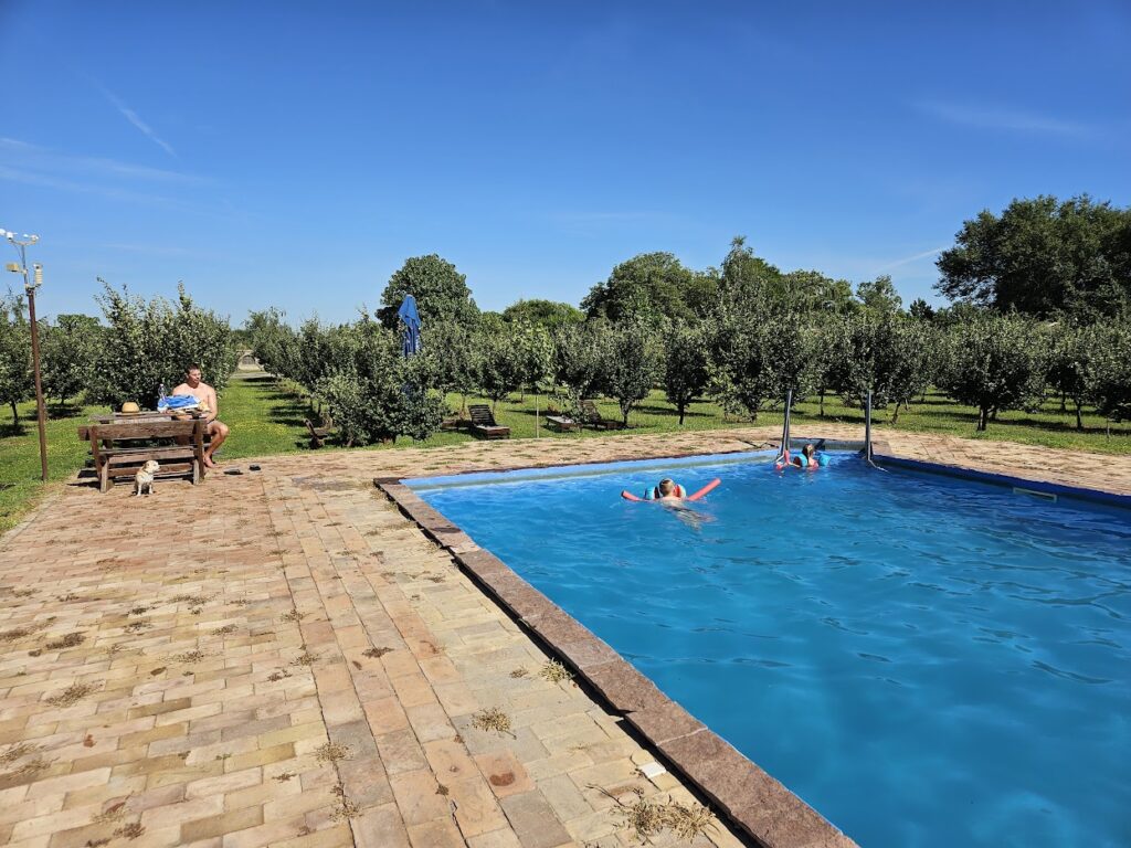 In Servië zochten we als eerst een camping nabij de stad Novi Sad. Ik vond camping ‘Salas Farma’. Een kleine camping op het terrein van een boerderij. De camper konden we aan de rand van een boomgaard. Middenin de boomgaard vind je nog een zwembad en een kleine speeltuin. Het sanitair is verouderd, maar echt prima. Op het terrein loopt een hond rond en die is echt super vriendelijk. De kinderen hebben leuk met hem gespeeld en onze pup was meteen vrienden met hem.