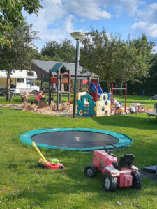 De camping heeft een leuk, klein speeltuintje voor jonge kinderen. Er is een stenen klimtoestel met touwen en een glijbaan en er zijn trampolines. Ook met een emmertje en schepjes vermaakten de kinderen zich in de speeltuin met de kleine kiezeltjes.