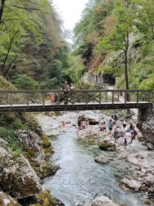 Vanuit deze camping zijn we doorgereden naar Tolmin. Een leuk stadje. We hebben hier de Tolmin kloof bezocht. Dit ligt in het Triglav National Park. Je loopt er langs pad over bruggetjes, rotsen en veel trappen. Voor ons en de kinderen was het echter prima te doen en je krijgt er veel voor terug, want de kloof is echt prachtig! Het water is wederom erg helder, mooi blauw en de natuur is geweldig.